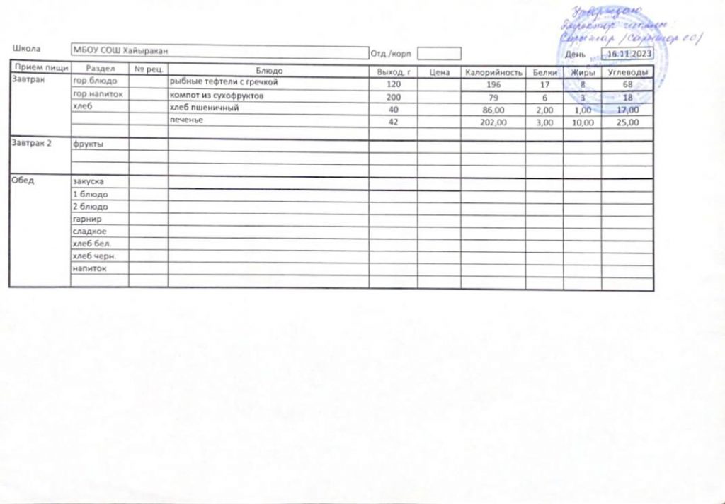 Утвержденное меню на 16 ноября 2023 года