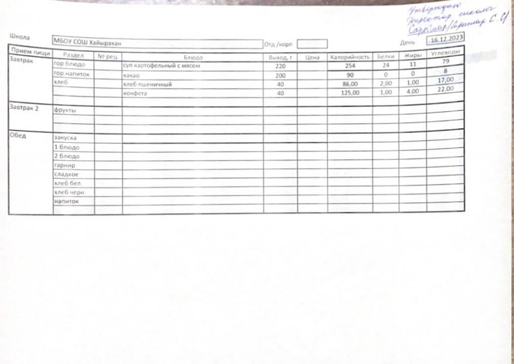 Утвержденное меню на 16 декабря 2023 года