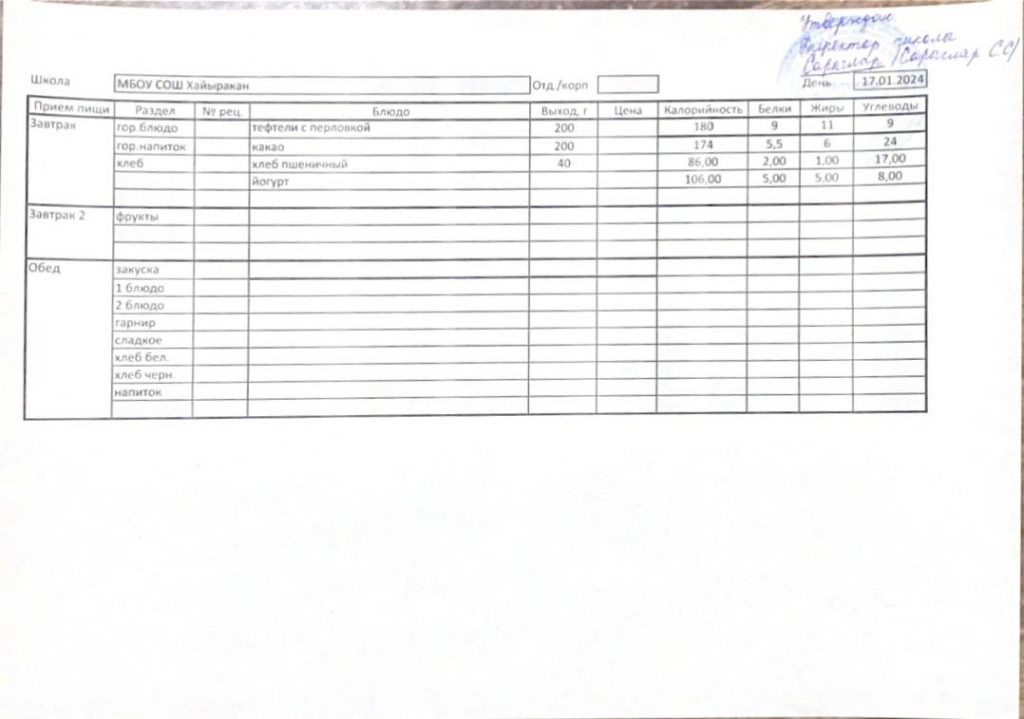 Утвержденное меню на 17 января 2024 года