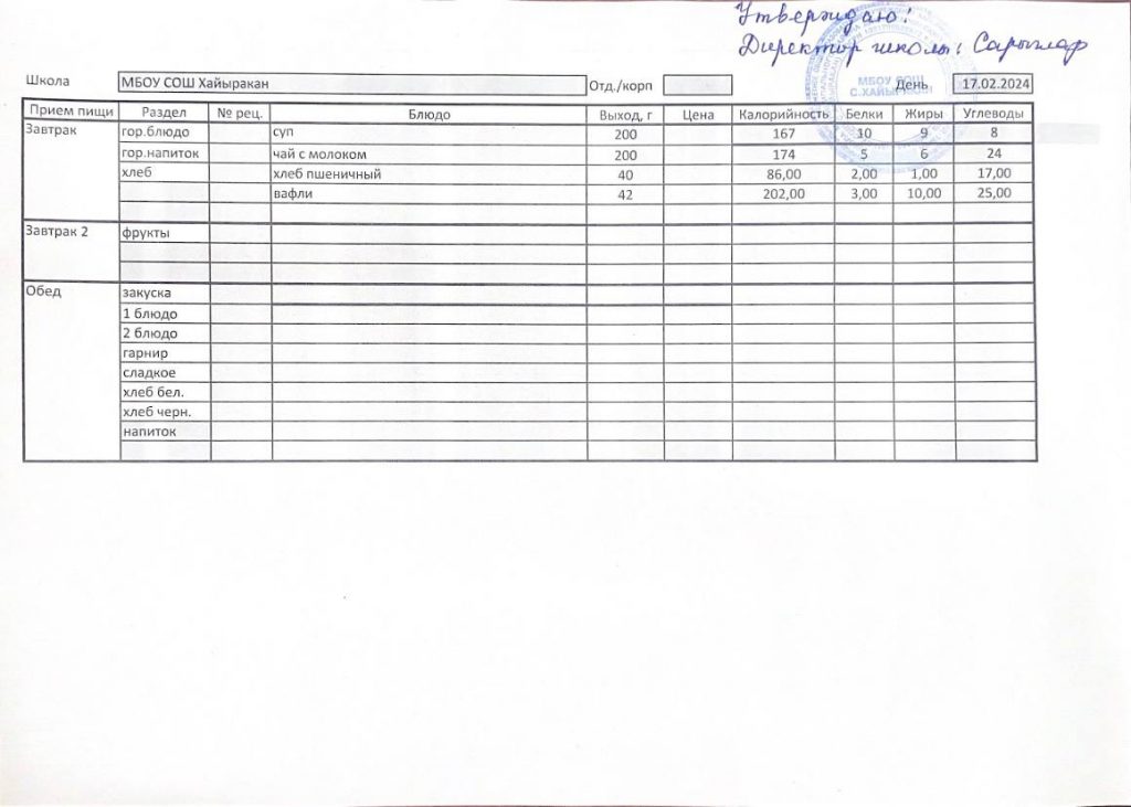 Утвержденное меню на 17 февраля 2024 года