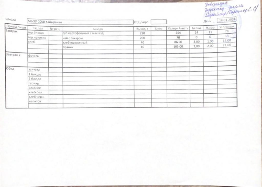 Утвержденное меню на 18 января 2024 года