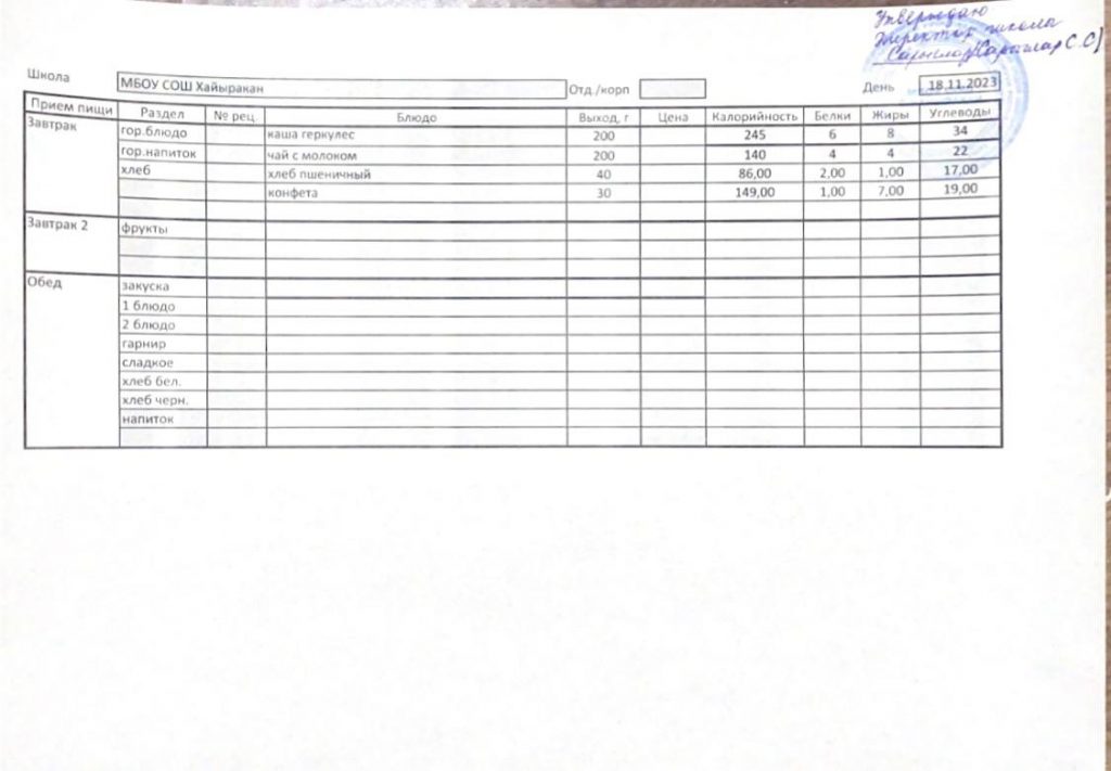 Утвержденное меню на 20 ноября 2023 года