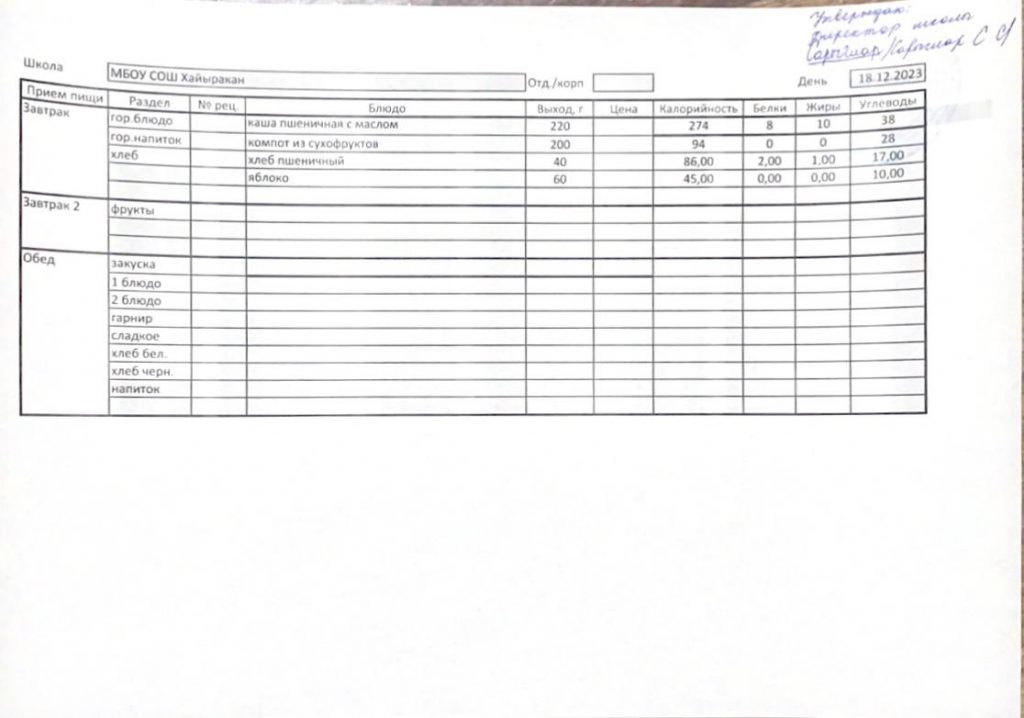 Утвержденное меню на 18 декабря 2023 года