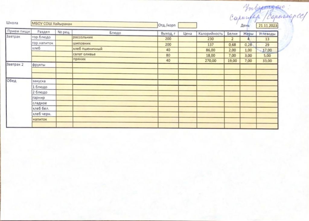 Утвержденное меню на 21 ноября 2023 года