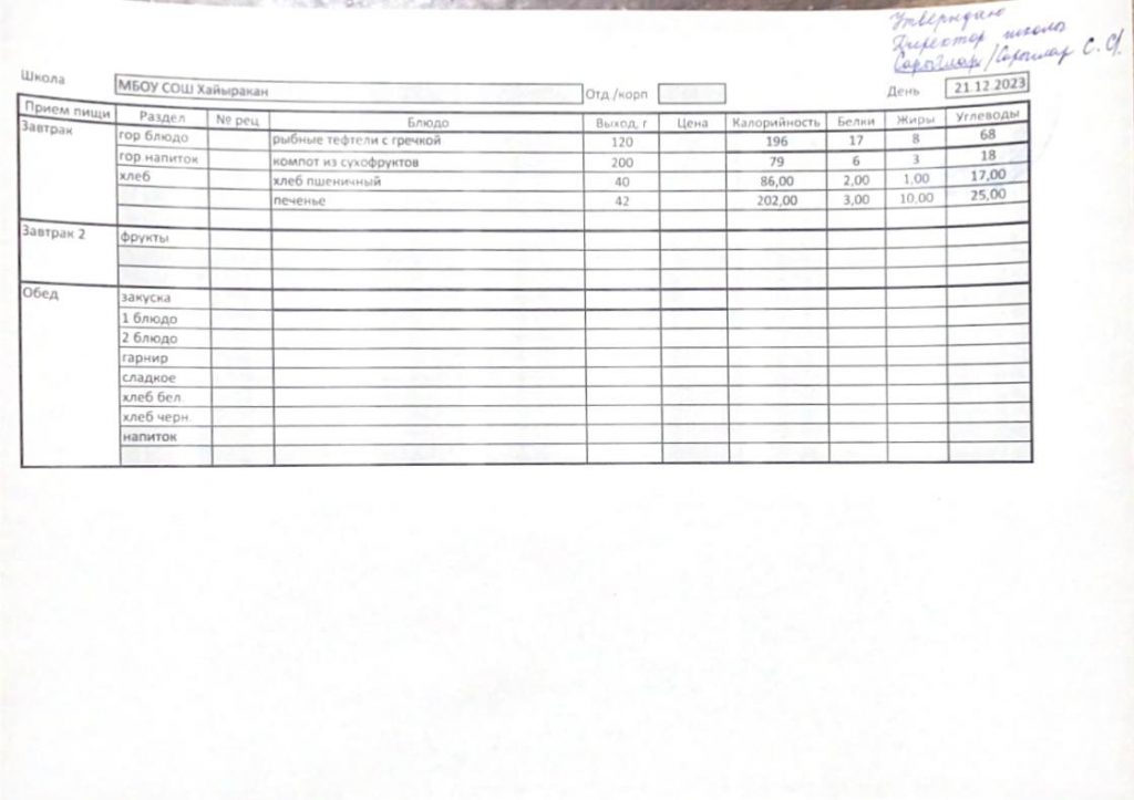 Утвержденное меню на 21 декабря 2023 года