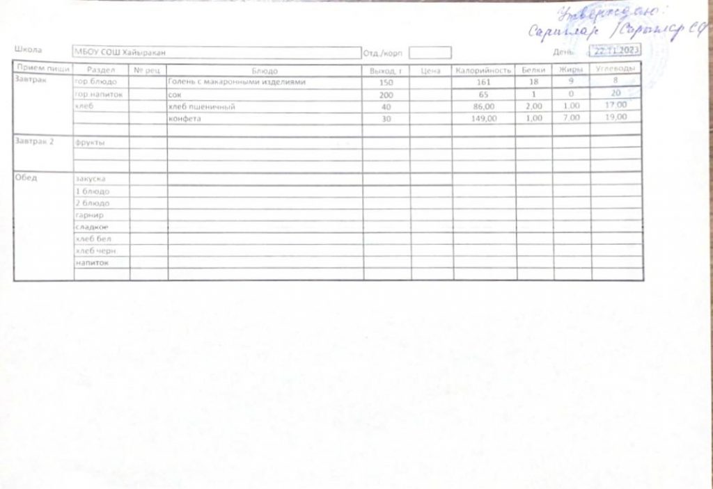 Утвержденное меню на 22 ноября 2023 года