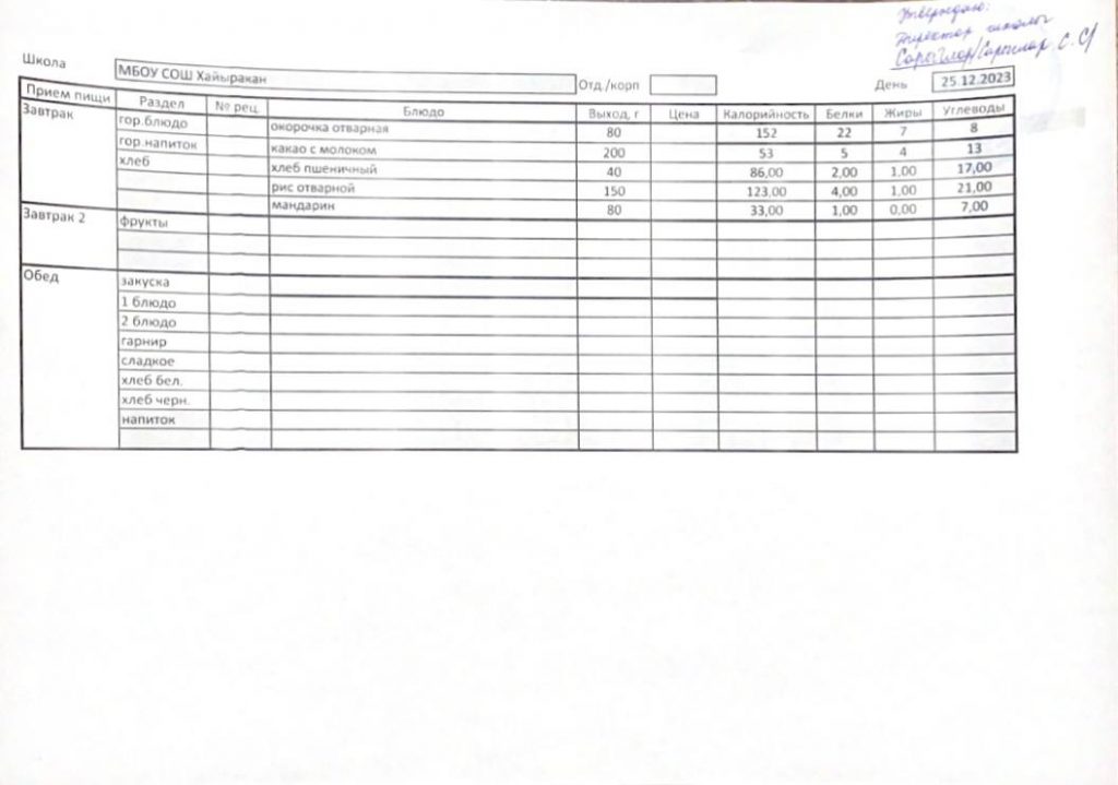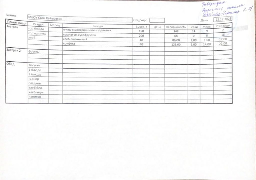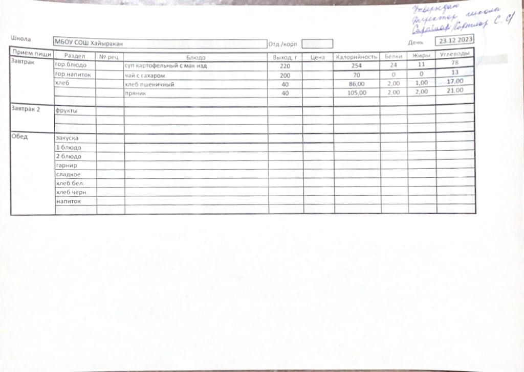 Утвержденное меню на 23 декабря 2023 года