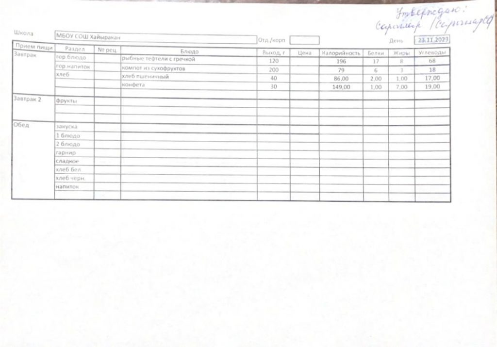 Утвержденное меню на 23 ноября 2023 года
