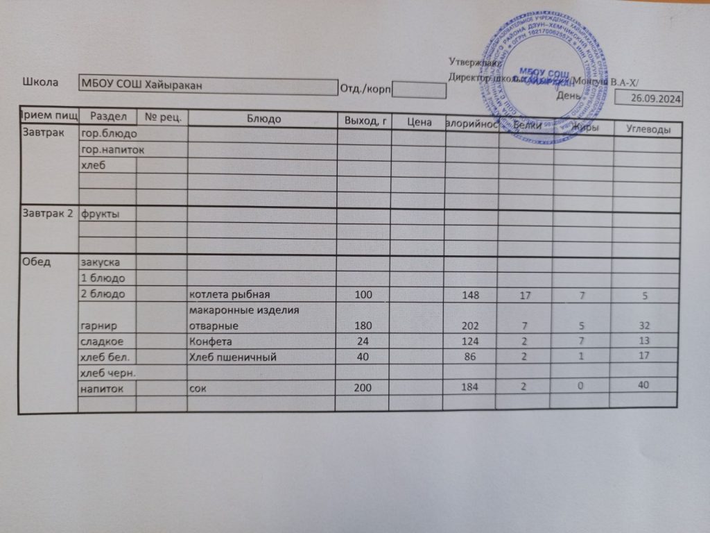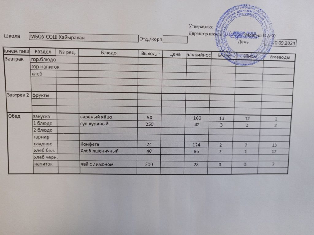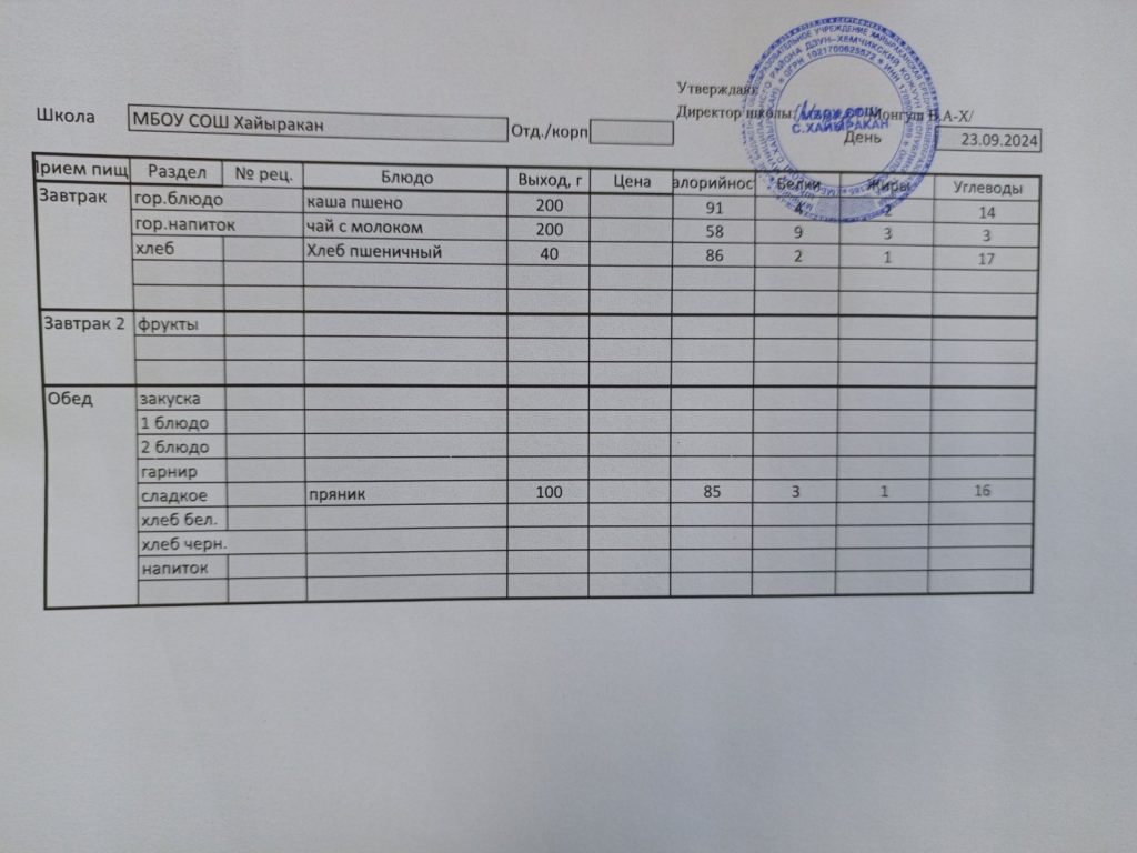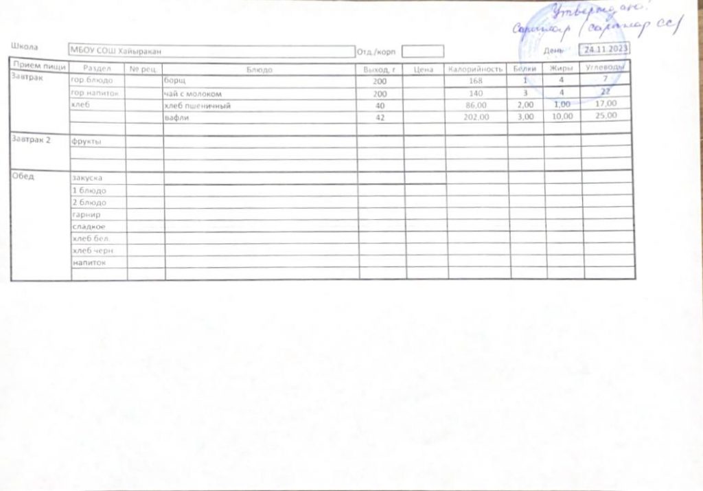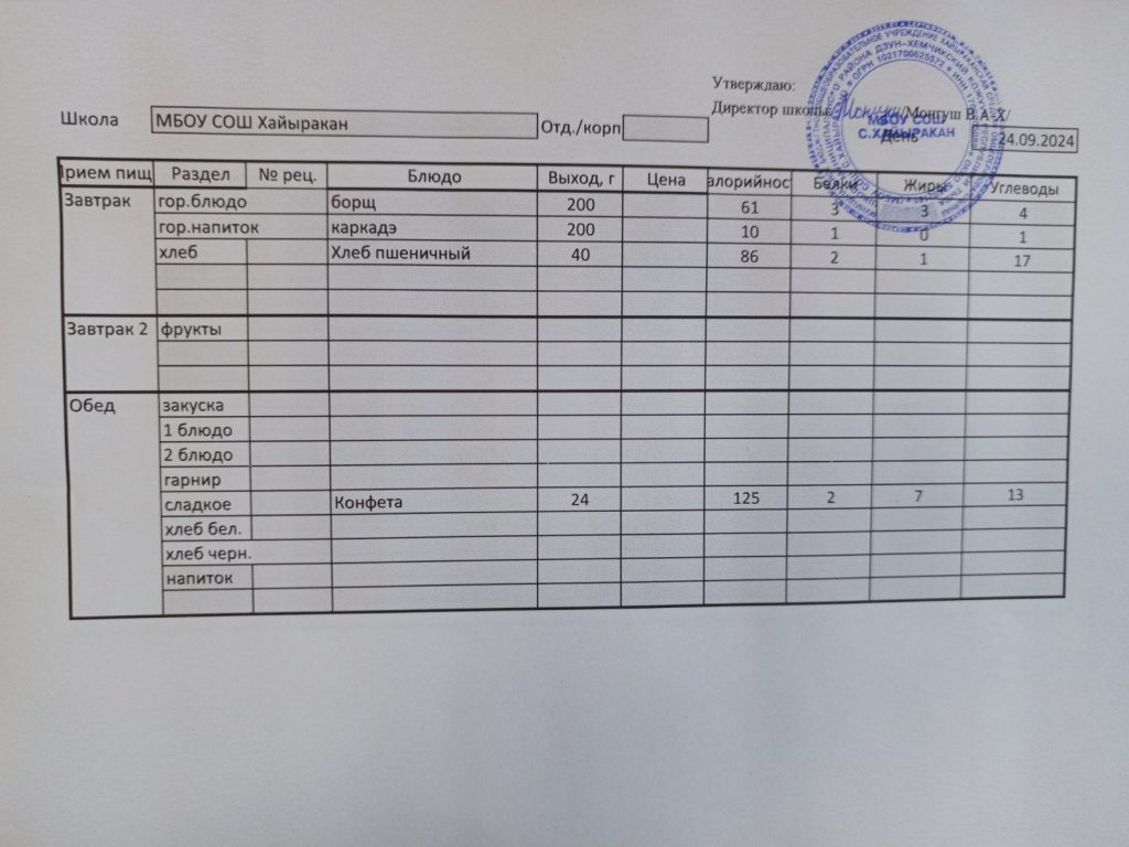 Утвержденное меню на 24 сентября 2024 года