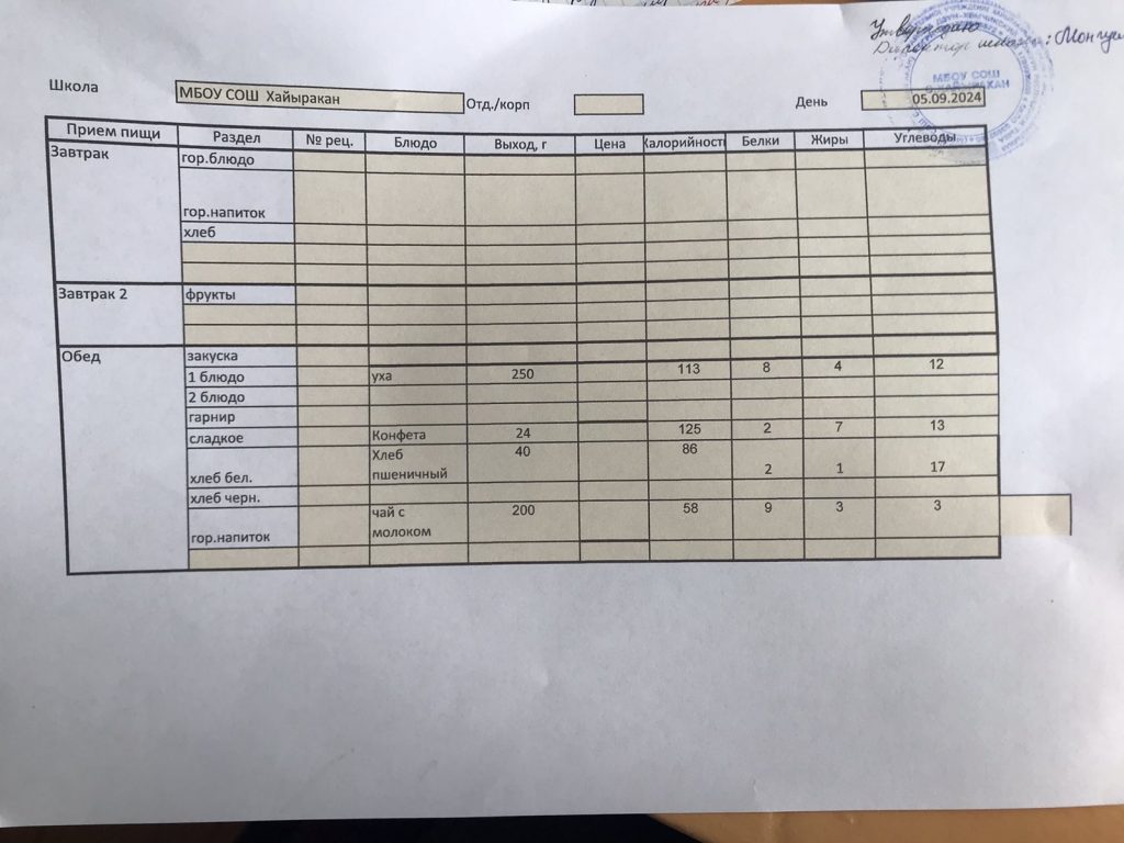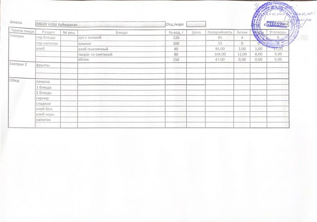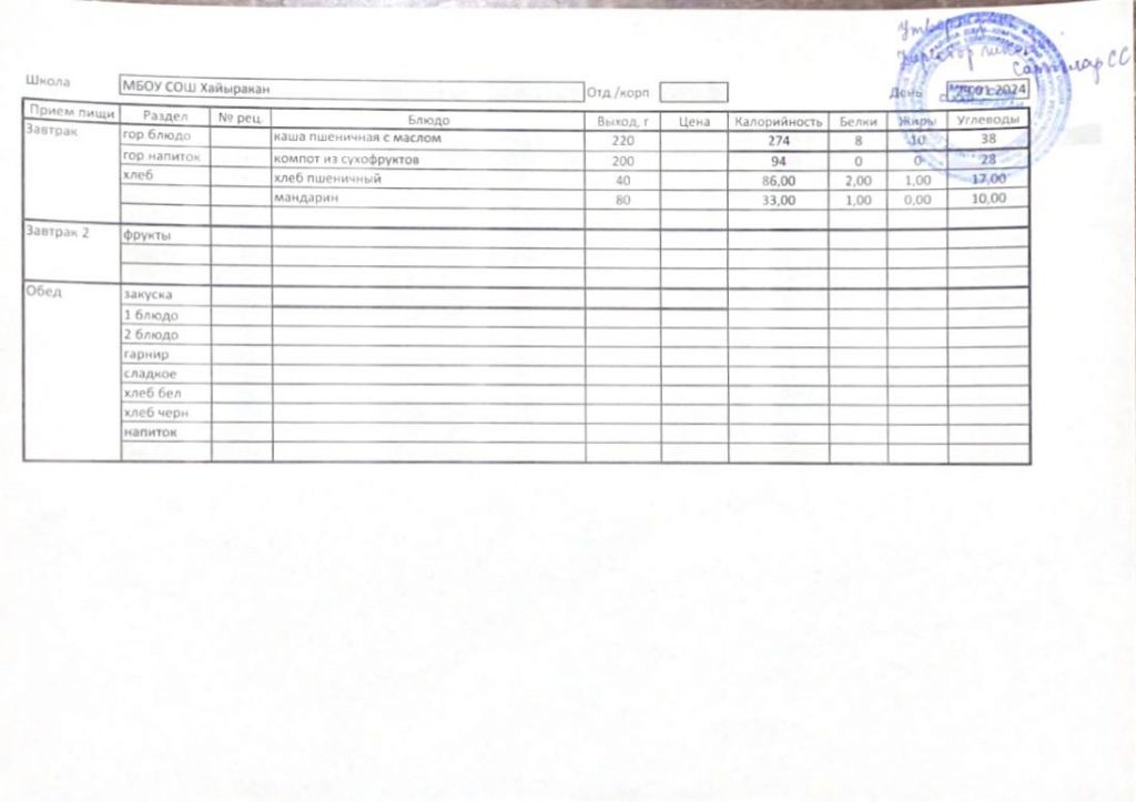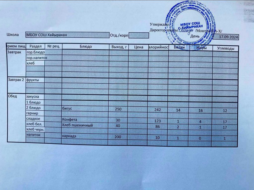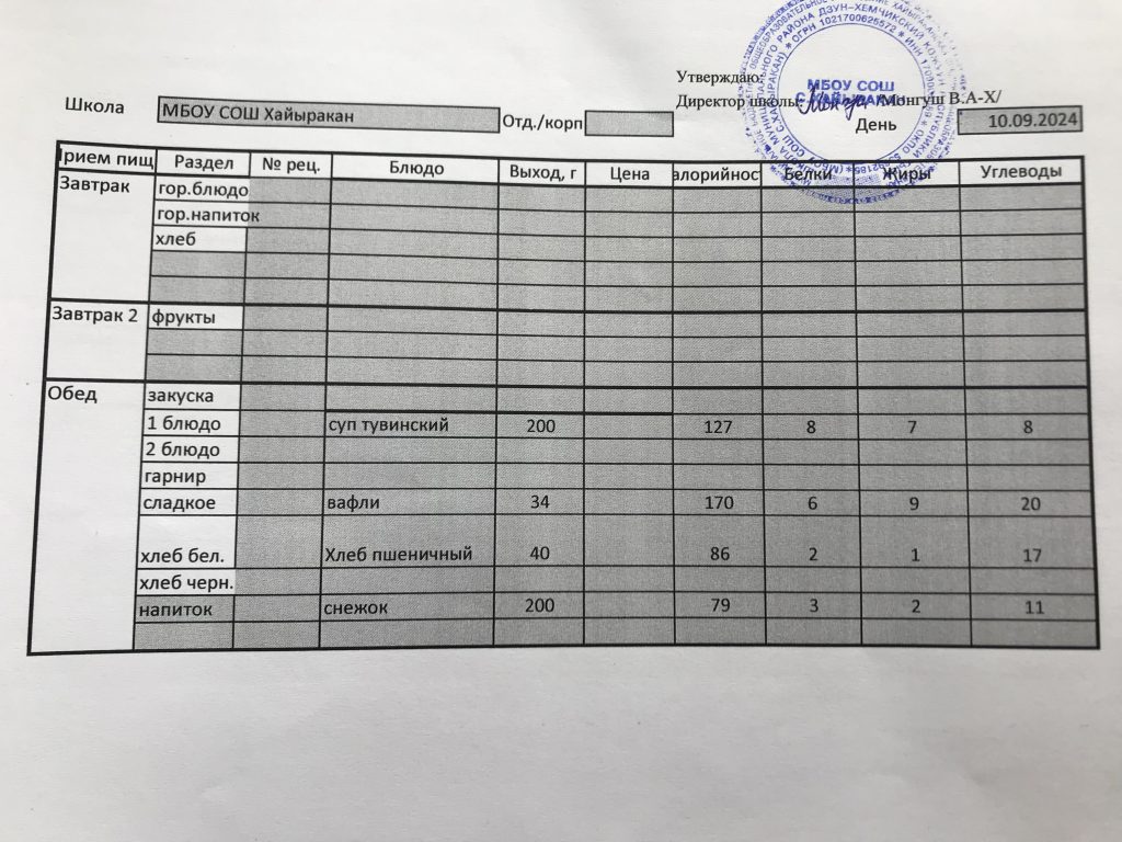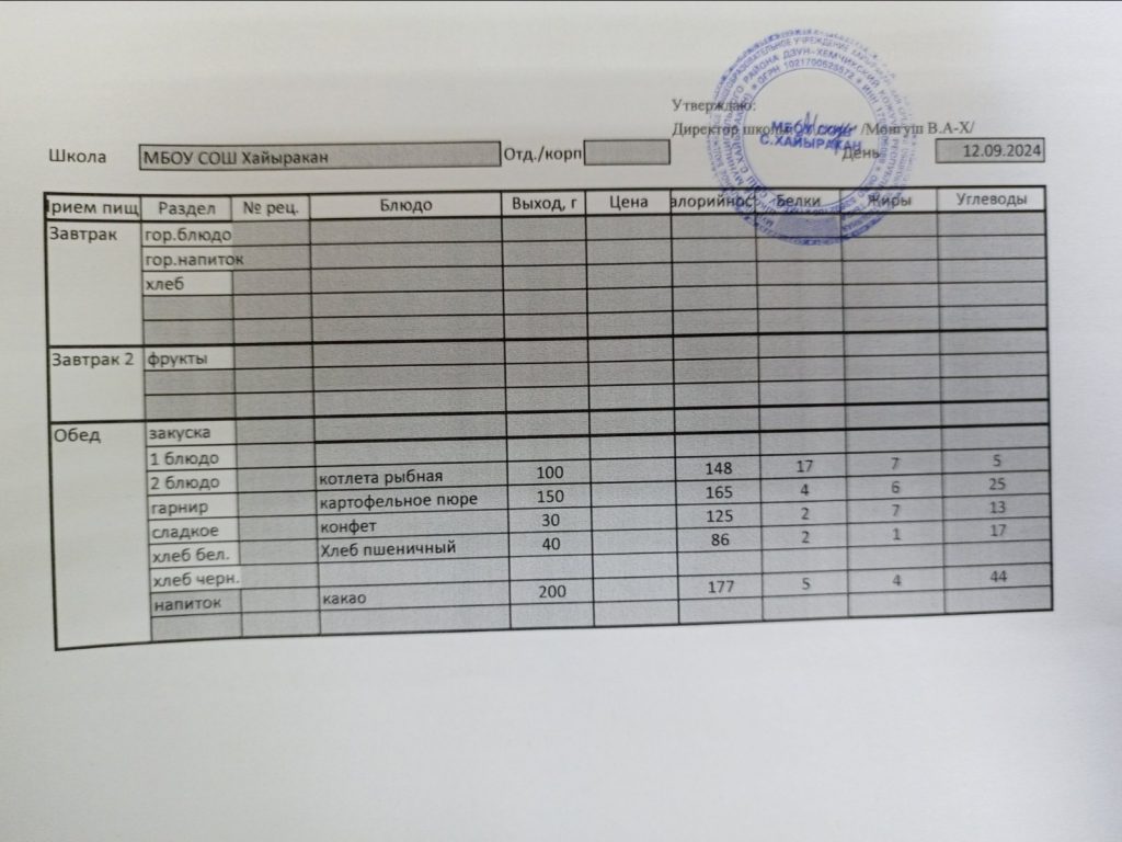 Утвержденное меню на 24 сентября 2024 года