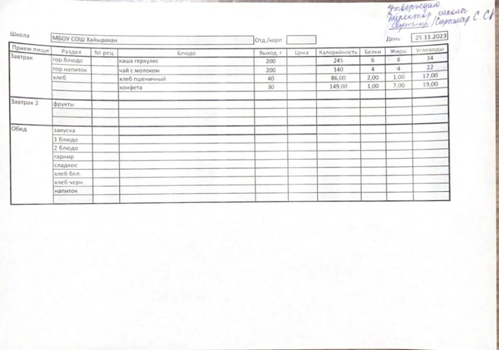 Утвержденное меню на 25 ноября 2023 года