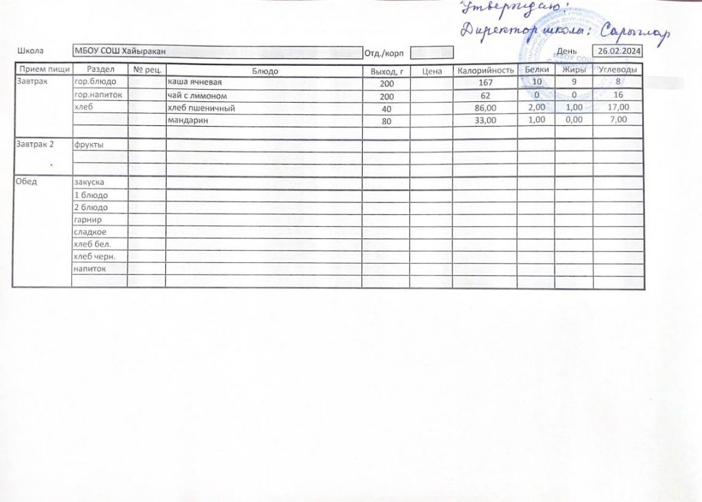 Утвержденное меню на 26 февраля 2024 года
