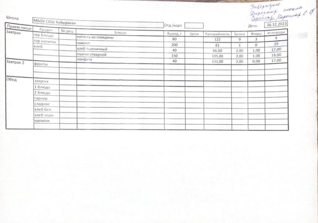 Утвержденное меню на 26 декабря 2023 года