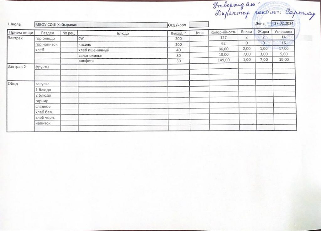 Утвержденное меню на 27 февраля 2024 года