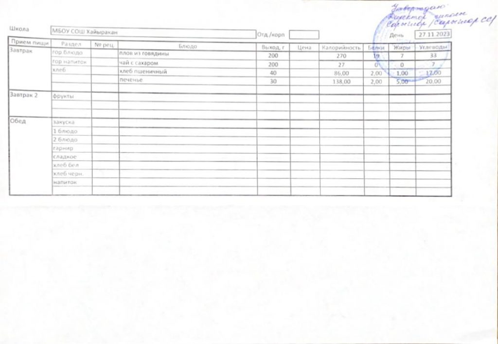 Утвержденное меню на 27 ноября 2023 года