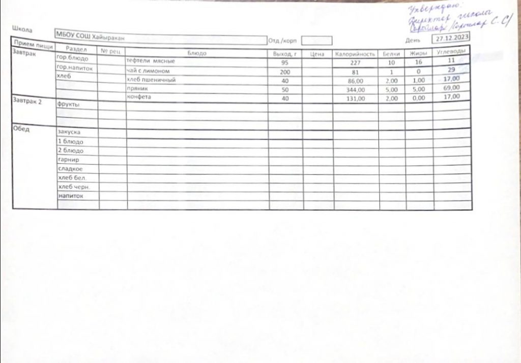 Утвержденное меню на 27 декабря 2023 года