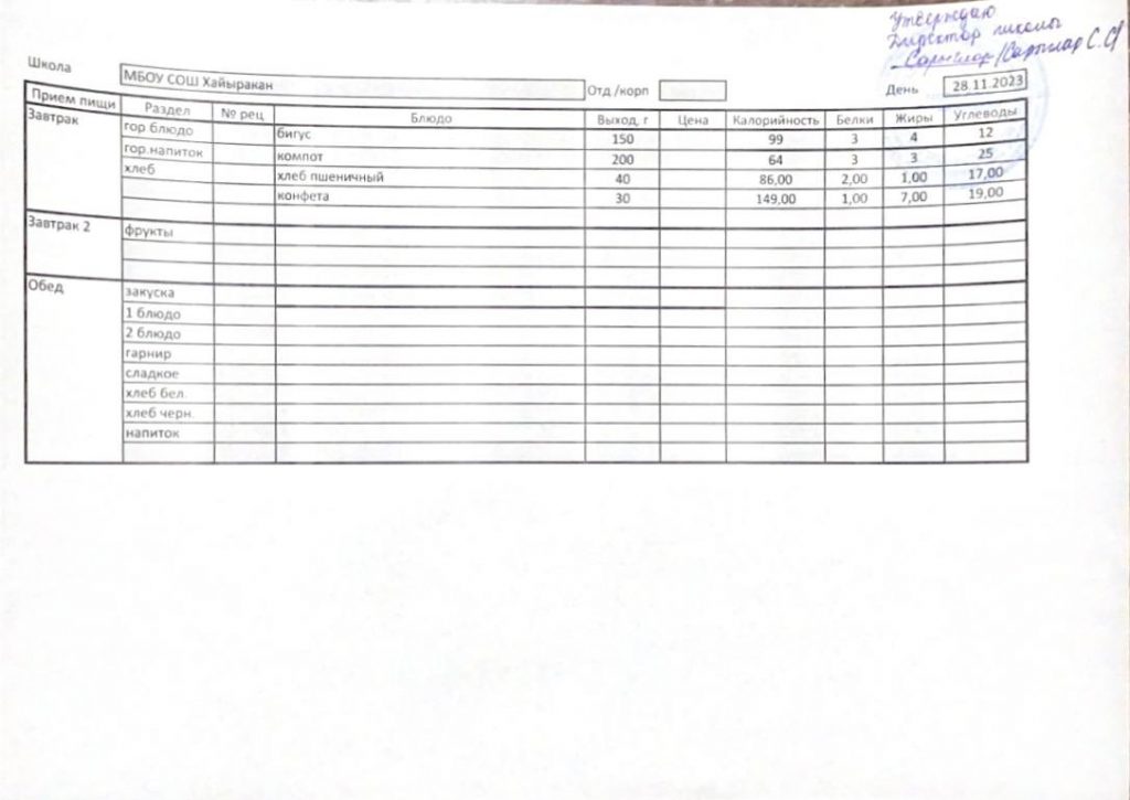 Утвержденное меню на 28 ноября 2023 года
