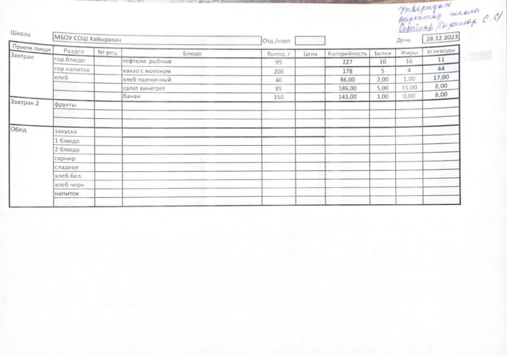 Утвержденное меню на 28 декабря 2023 года