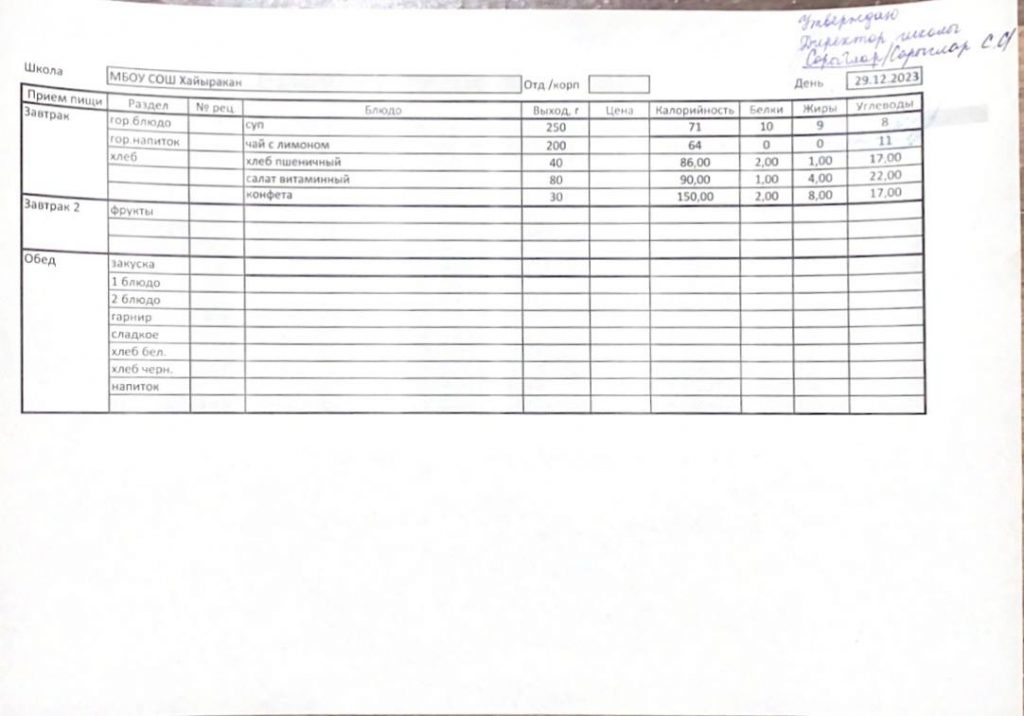 Утвержденное меню на 29 декабря 2023 года