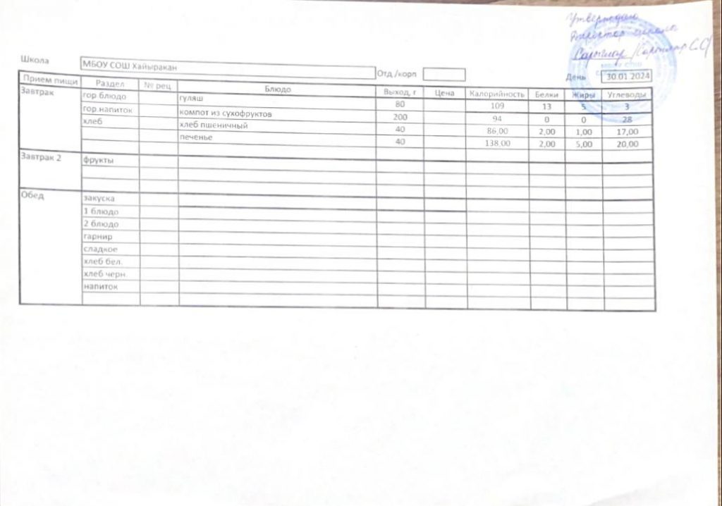 Утвержденное меню на 30 января 2024 года