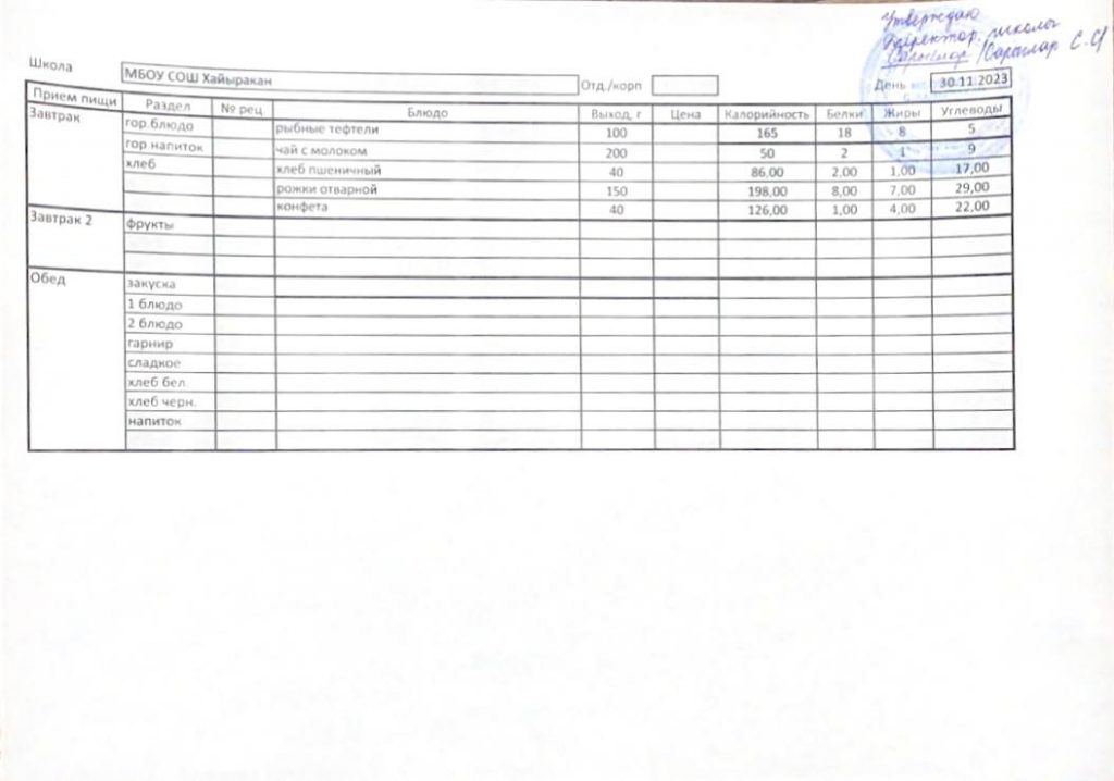 Утвержденное меню на 30 ноября 2023 года