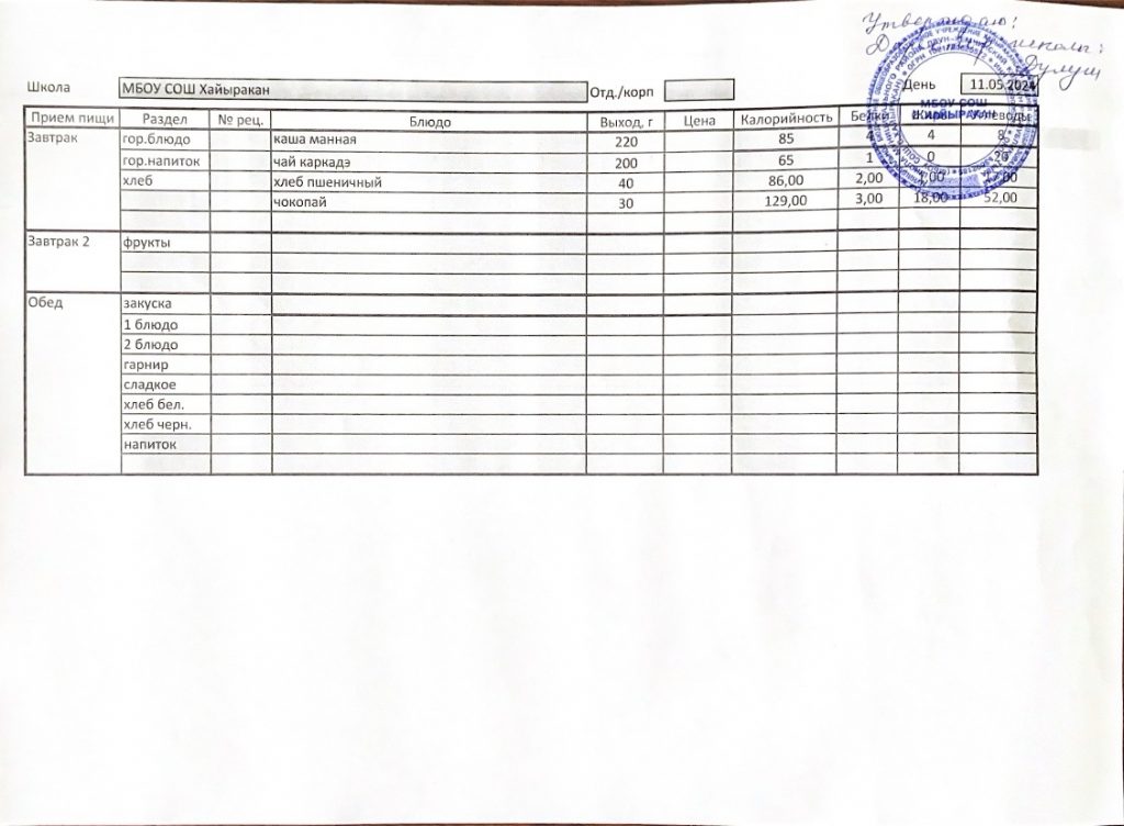 Утвержденное меню на 11 мая 2024 года