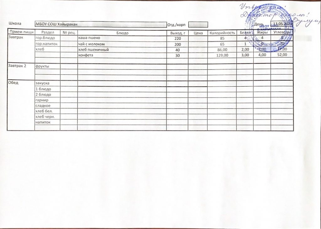 Утвержденное меню на 13 мая 2024 года