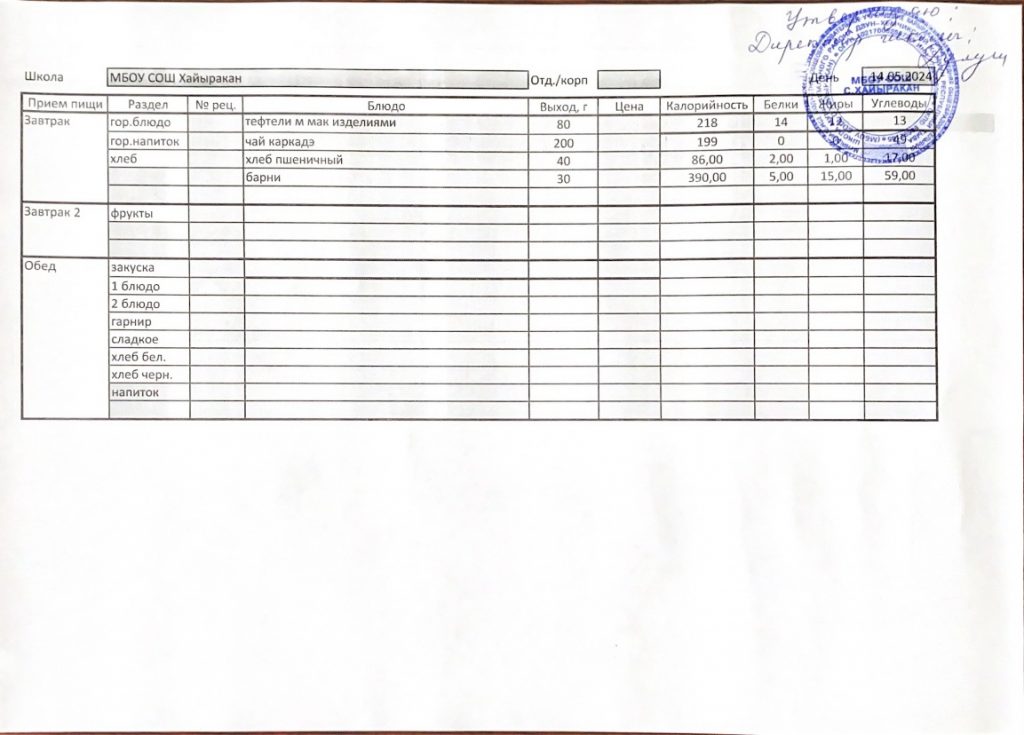 Утвержденное меню на 14 мая 2024 года