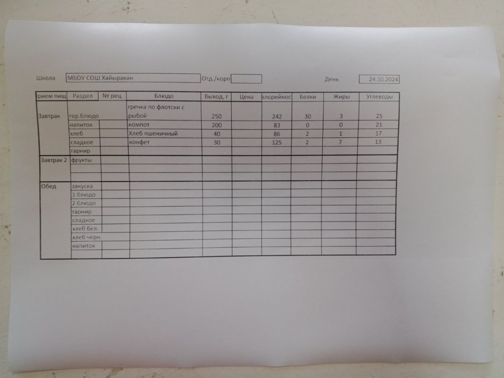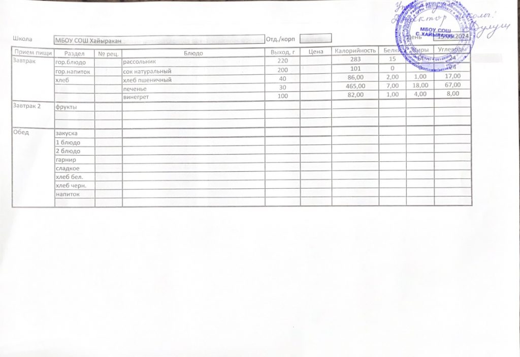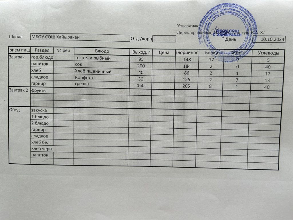 Утвержденное меню на 24 октября 2024 года