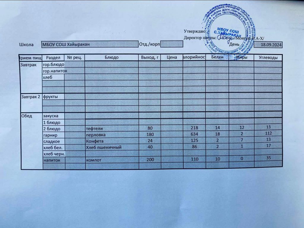 Утвержденное меню на 18 сентября 2024 года