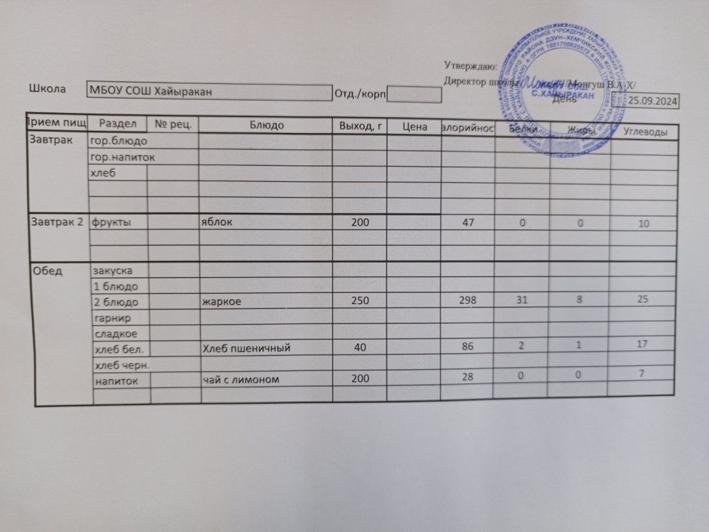 Утвержденное меню на 25 сентября 2024 года