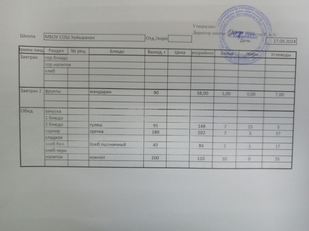 Утвержденное меню на 27 сентября 2024 года