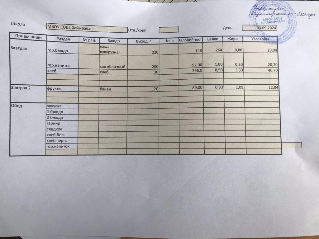 Утвержденное меню на 03 сентября 2024 года