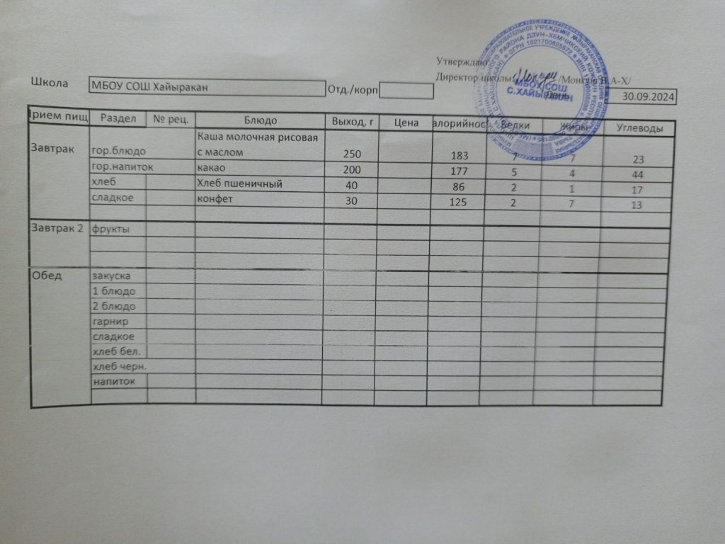 Утвержденное меню на 30 сентября 2024 года