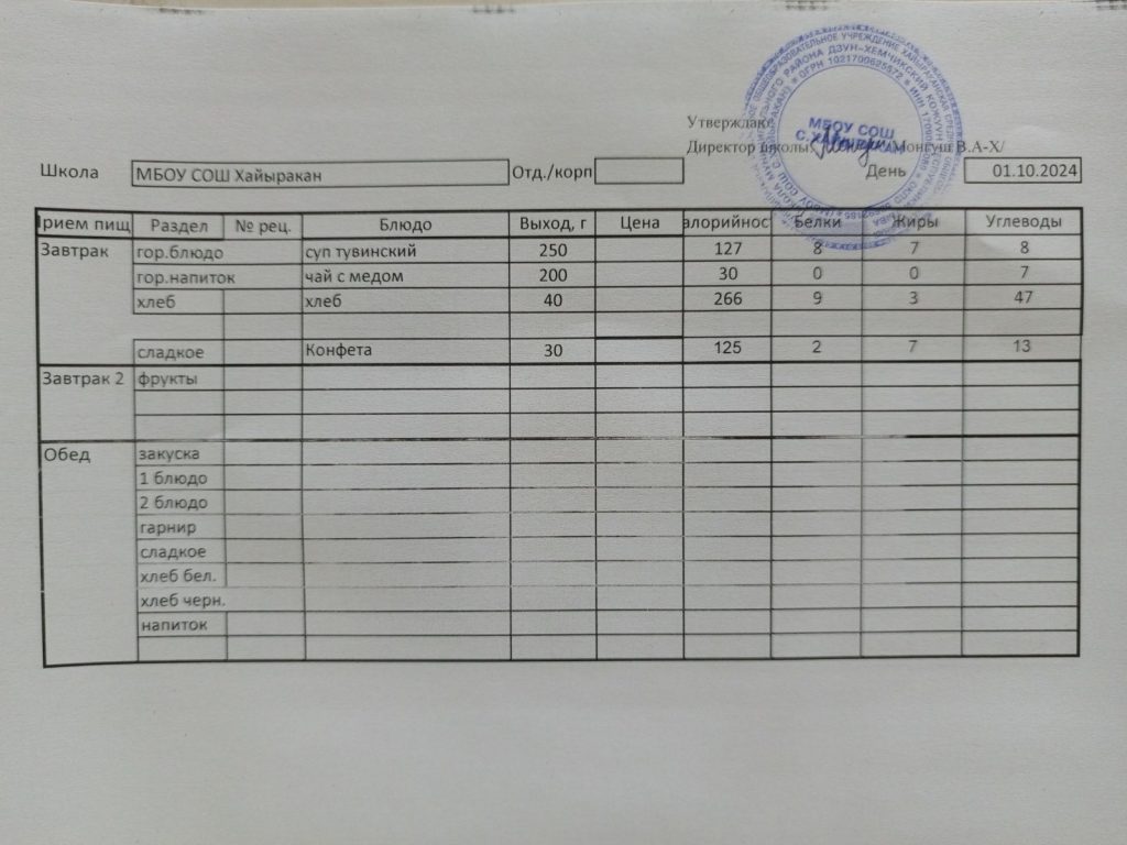 Утвержденное меню на 1 октября 2024 года