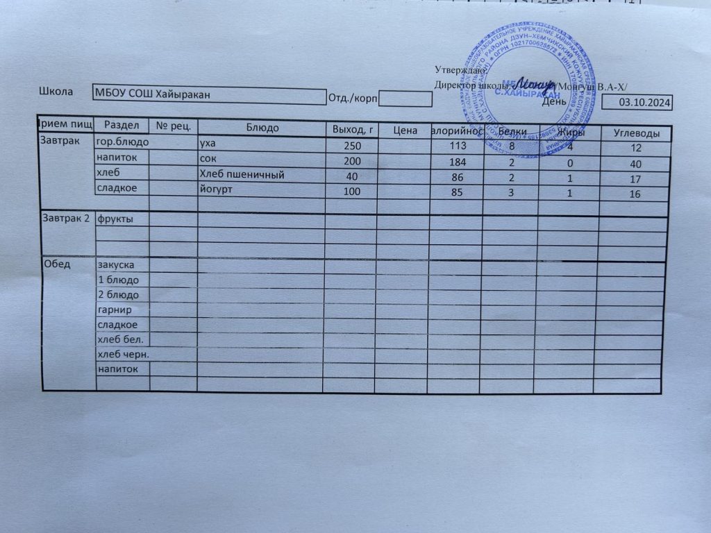 Утвержденное меню на 3 октября 2024 года