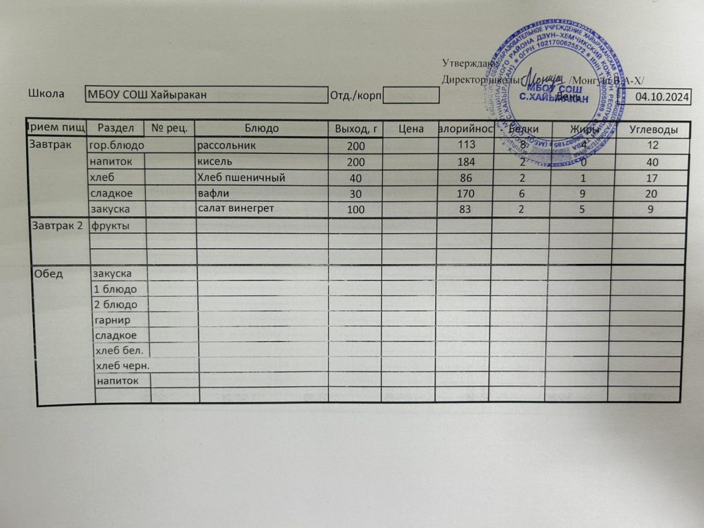 Утвержденное меню на 4 октября 2024 года