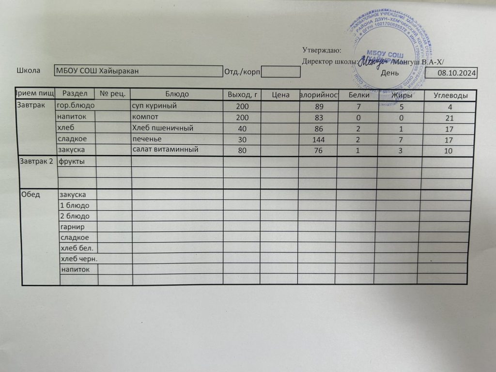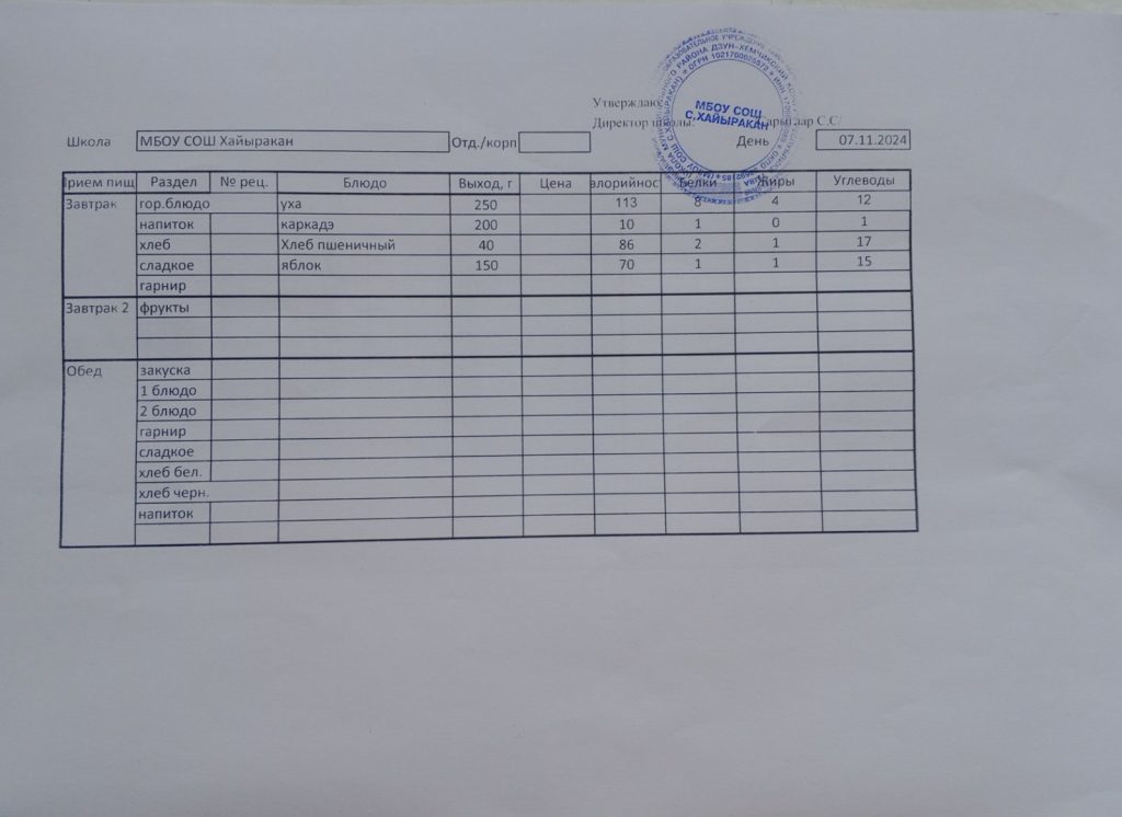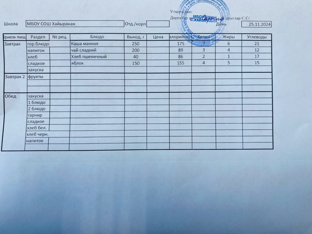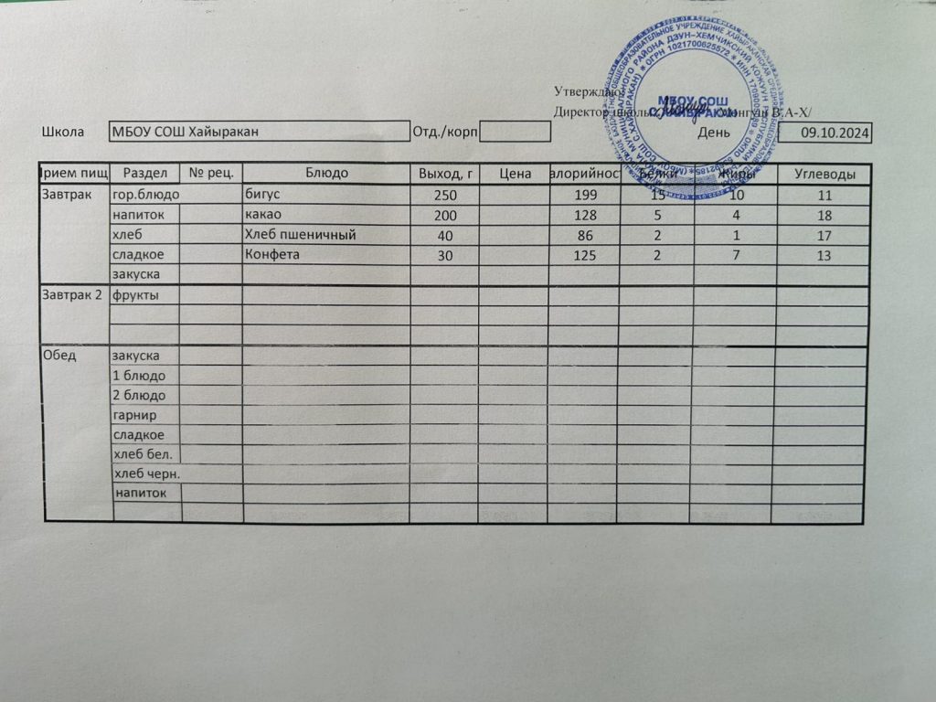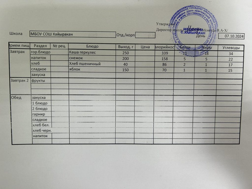 Утвержденное меню на 7 октября 2024 года