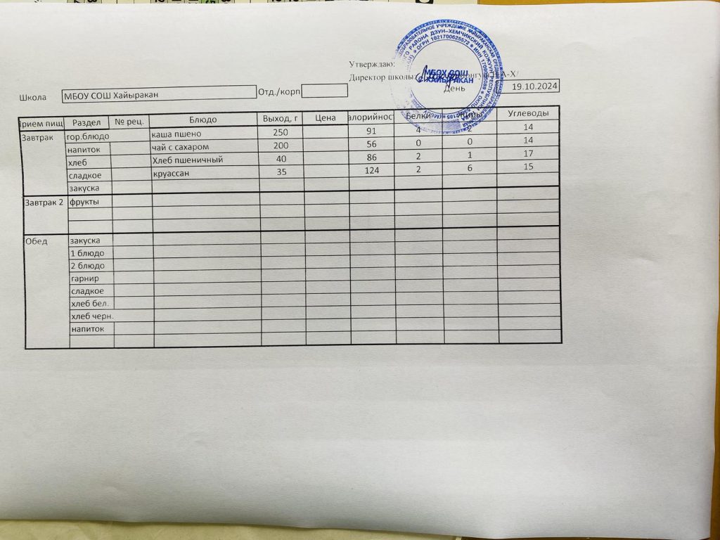 Утвержденное меню на 19 октября 2024 года