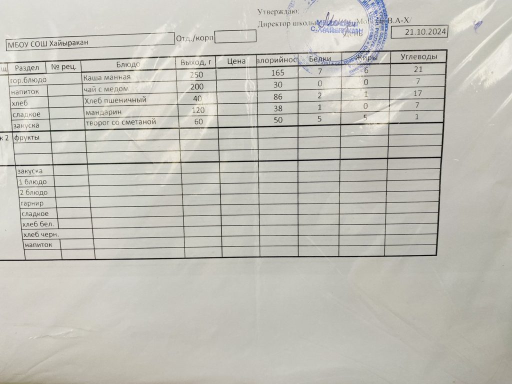 Утвержденное меню на 21 октября 2024 года