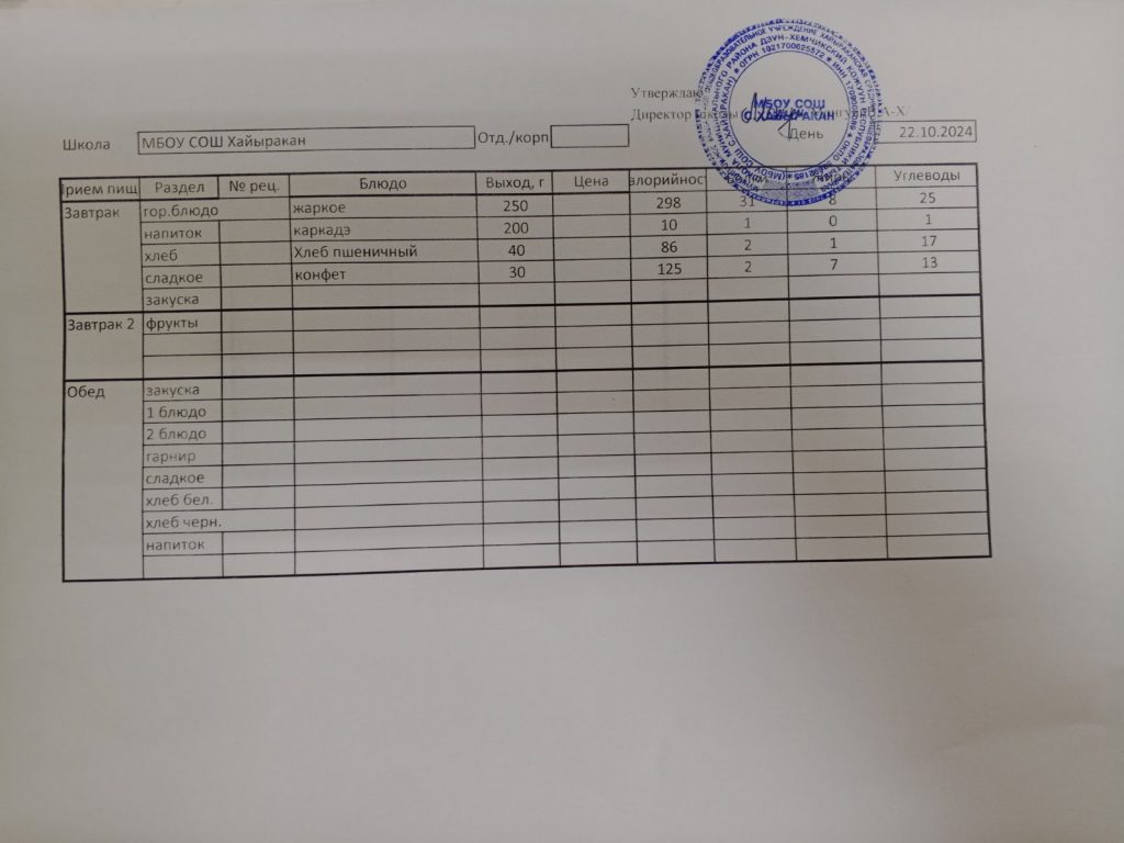Утвержденное меню на 22 октября 2024 года