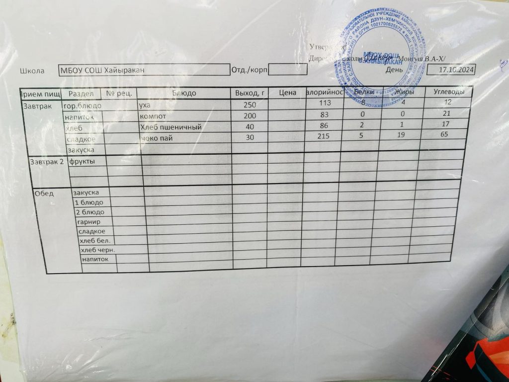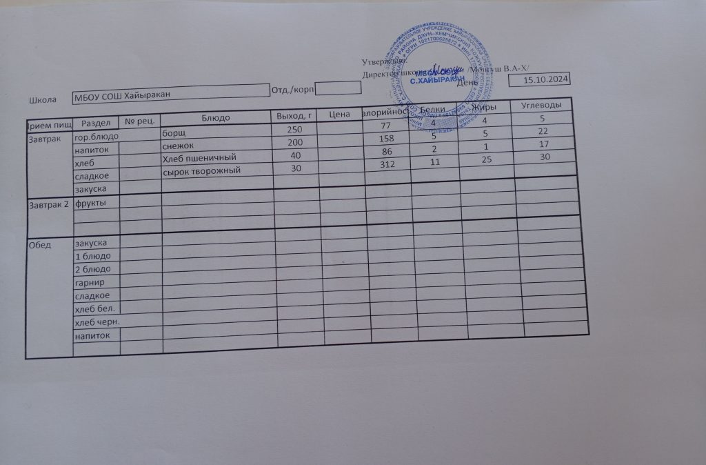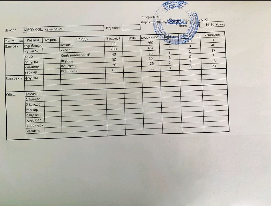 Утвержденное меню на 16 октября 2024 года