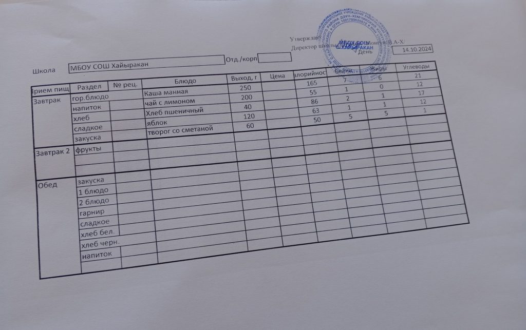 Утвержденное меню на 14 октября 2024 года