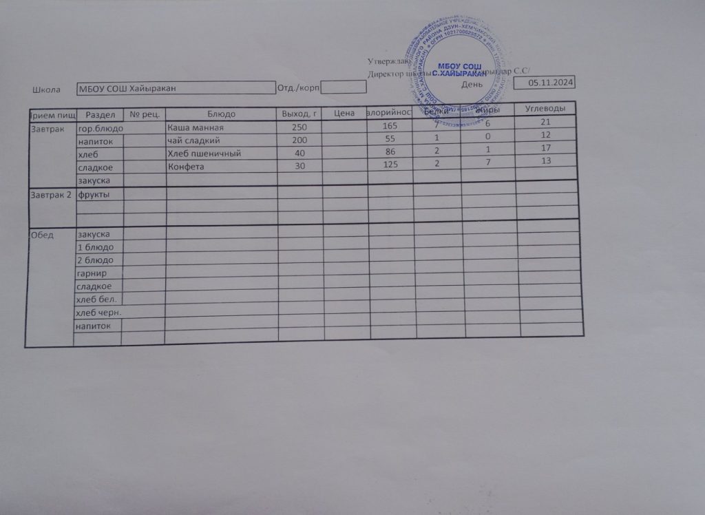 Утвержденное меню на 05 ноября 2024 года