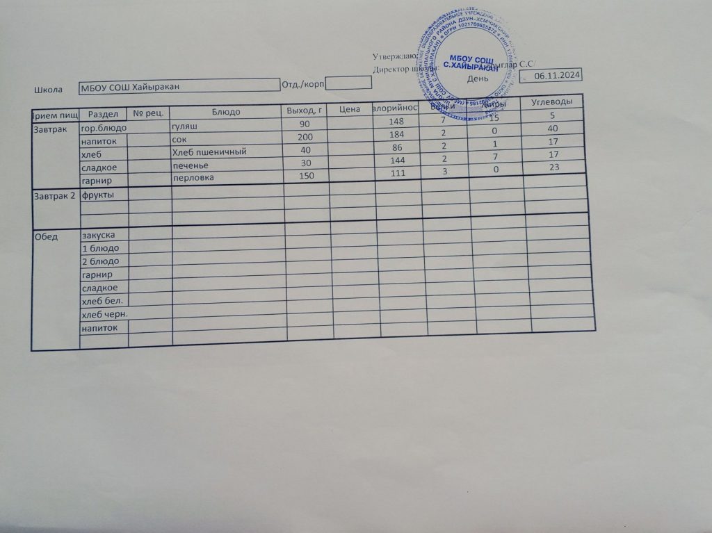Утвержденное меню на 06 ноября 2024 года