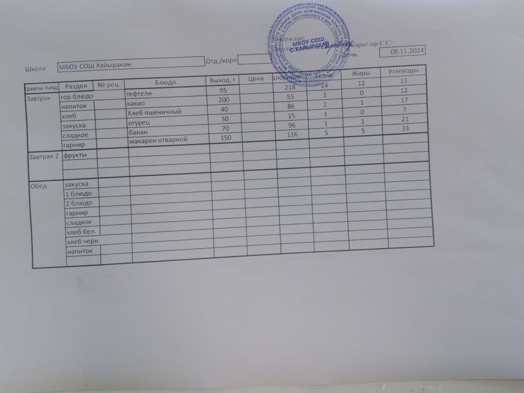 Утвержденное меню на 08 ноября 2024 года