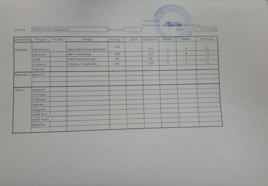 Утвержденное меню на 11 ноября 2024 года