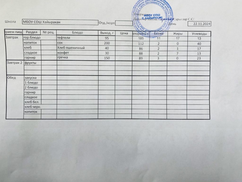 Утвержденное меню на 22 ноября 2024 года.