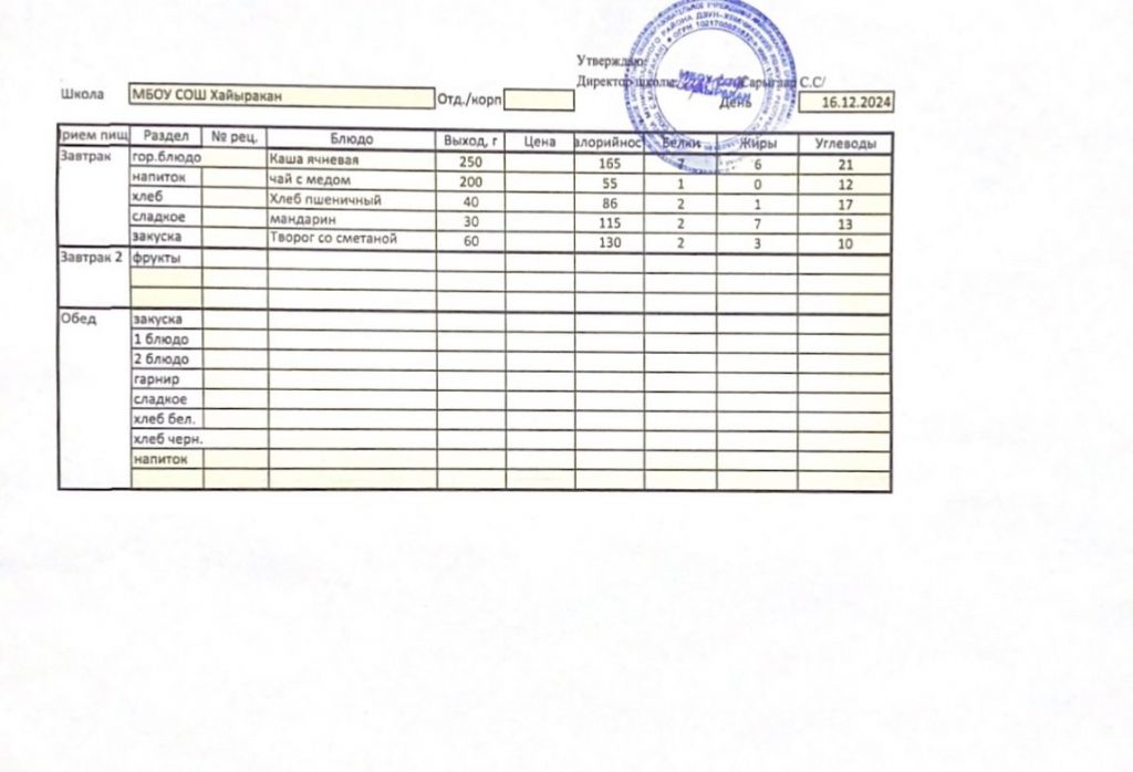 Утвержденное меню на 16 декабря 2024 года.