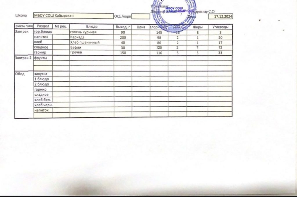 Утвержденное меню на 17 декабря 2024 года.